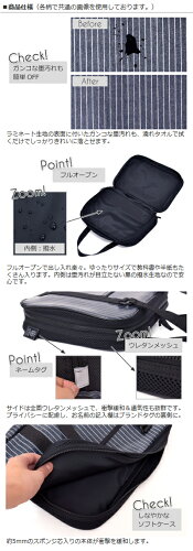 ※ラミネート生地以外の、縫い目やメッシュ部分、持ち手、パイピング、 内側などが汚れた場合は、なるべくすぐに拭取ってください。